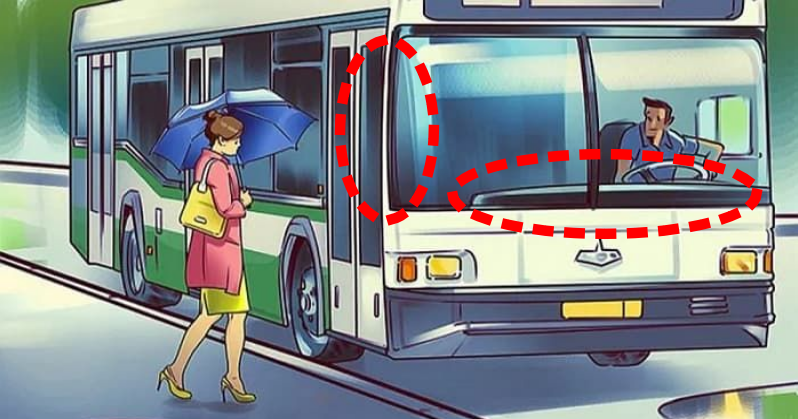 비가 내리는 날 운전을 하기 위해서는 앞의 시야를 확보할 수 있도록 와이퍼를 작동합니다. 하지만 그림 속의 버스에는 와이퍼가 없습니다.